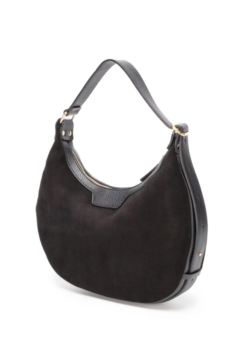 The crescent bad is a perfect size, made from premium leather and suede. The adjustable strap enables a shoulder bag or crossbody.