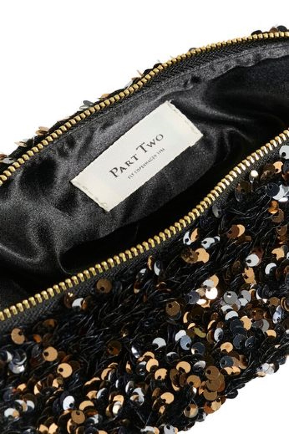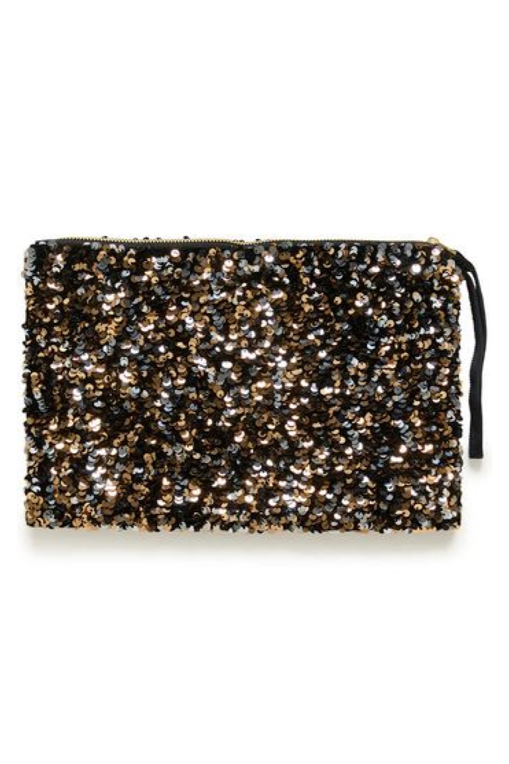 This small clutch is covered in sequins that catch the light and create a striking look. It features a zip closure and a practical side strap.