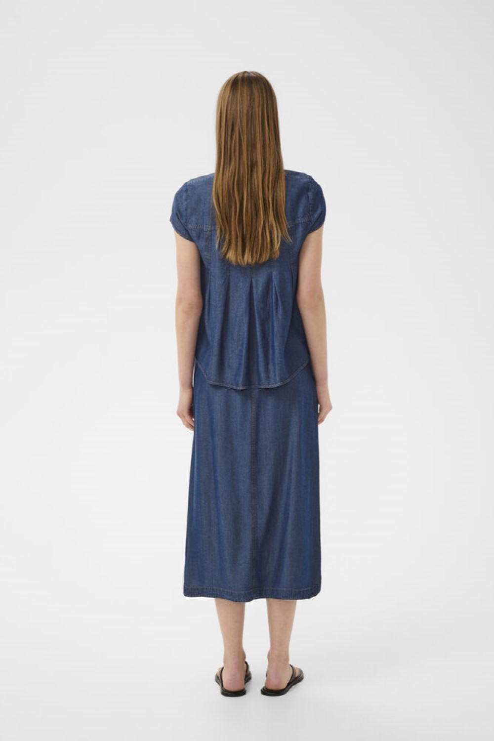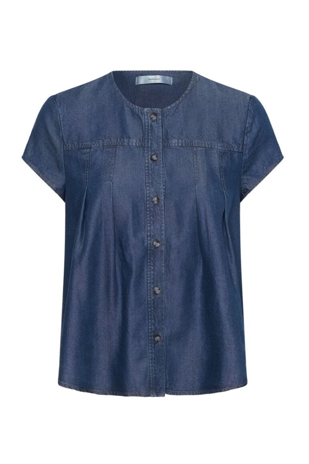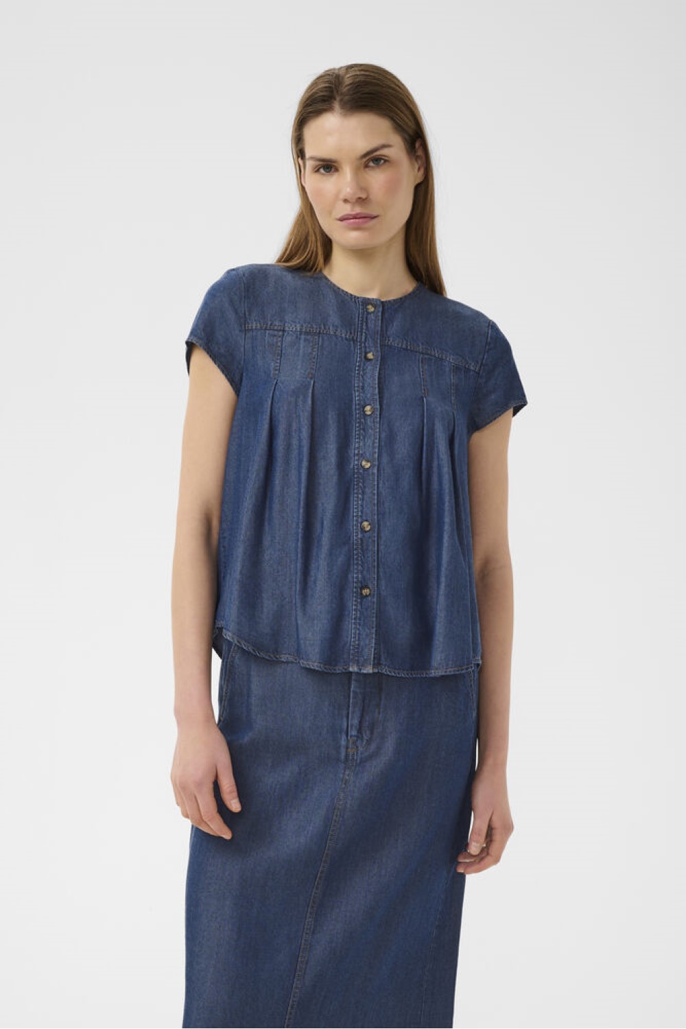 Denim shirt with a loose, slightly flared fit, short sleeves, and button-through front.