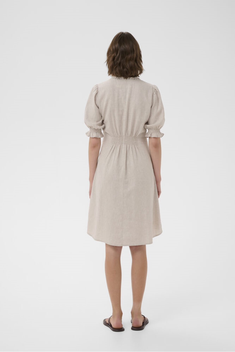 Popular linen mix dress from InWear. Flattering shale with short sleeves and gathered detail at the back. A must have for your summer wardrobe