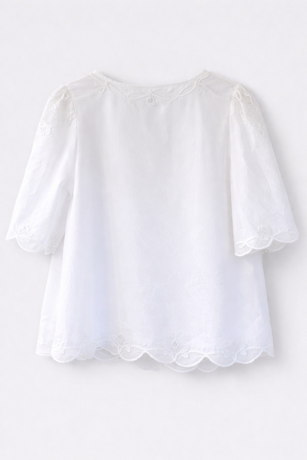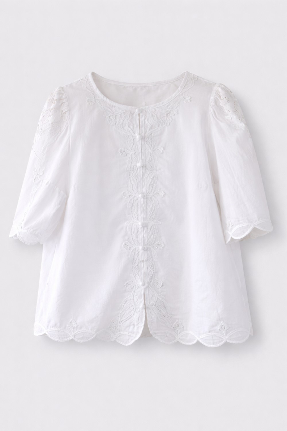 This statement blouse features intricate embroidery, softly structured wide sleeves, and a rounded neckline. A scalloped hem and button details give this blouse a neat finish.