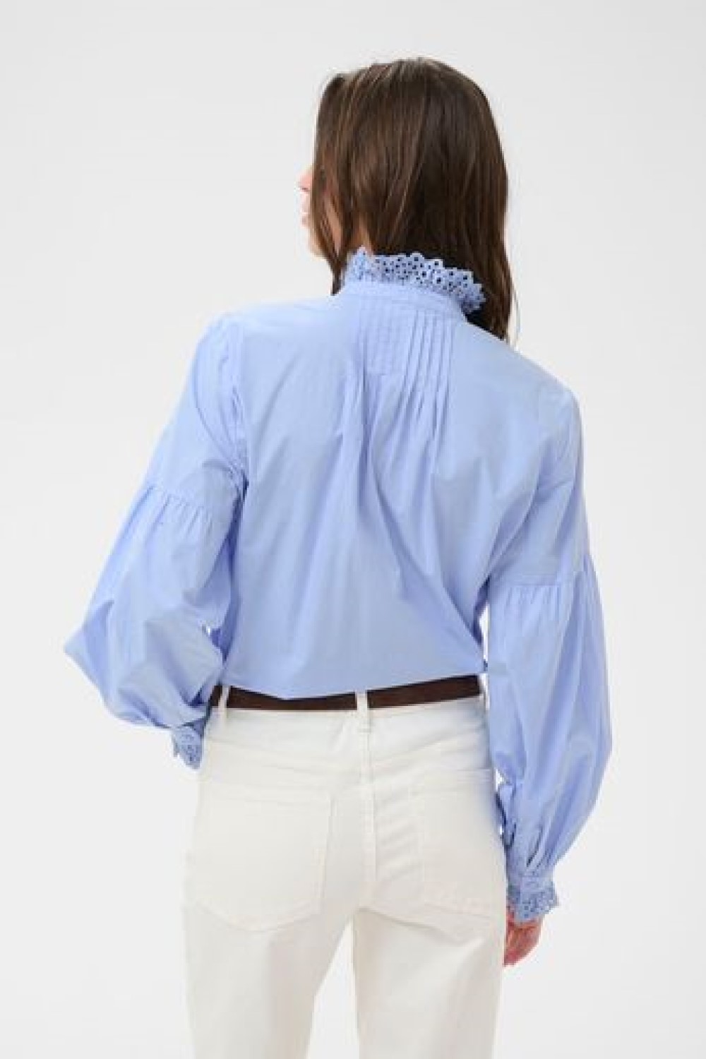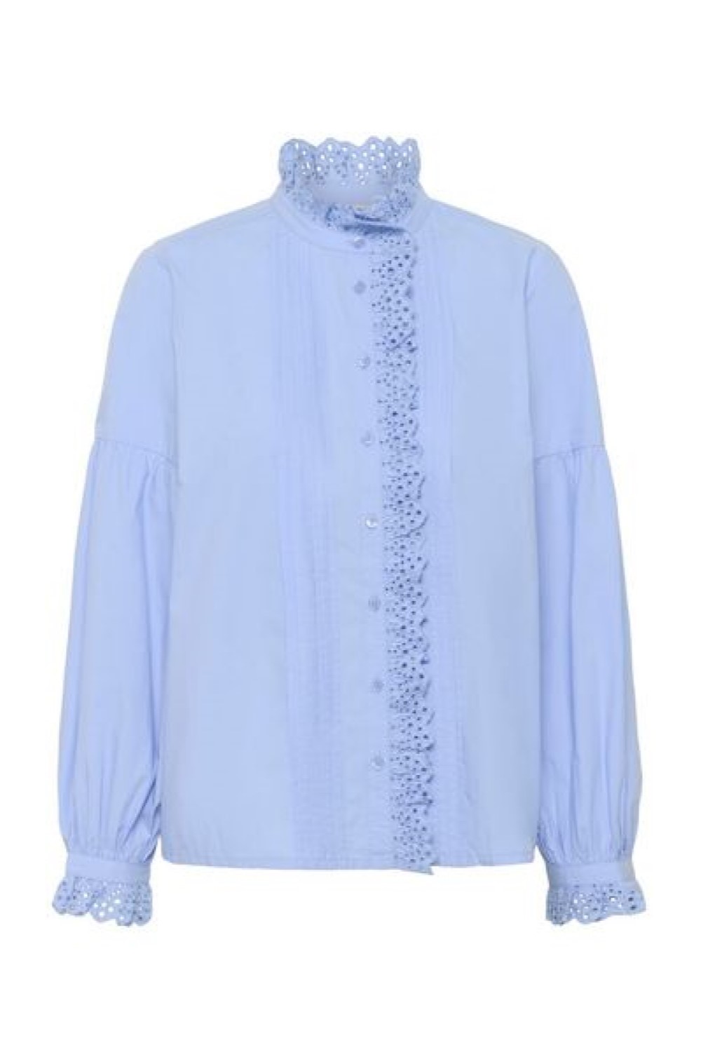 High neck cotton shirt with frill and pleat detail at the front and neck. Long sleeve with frill detail at the cuffs.