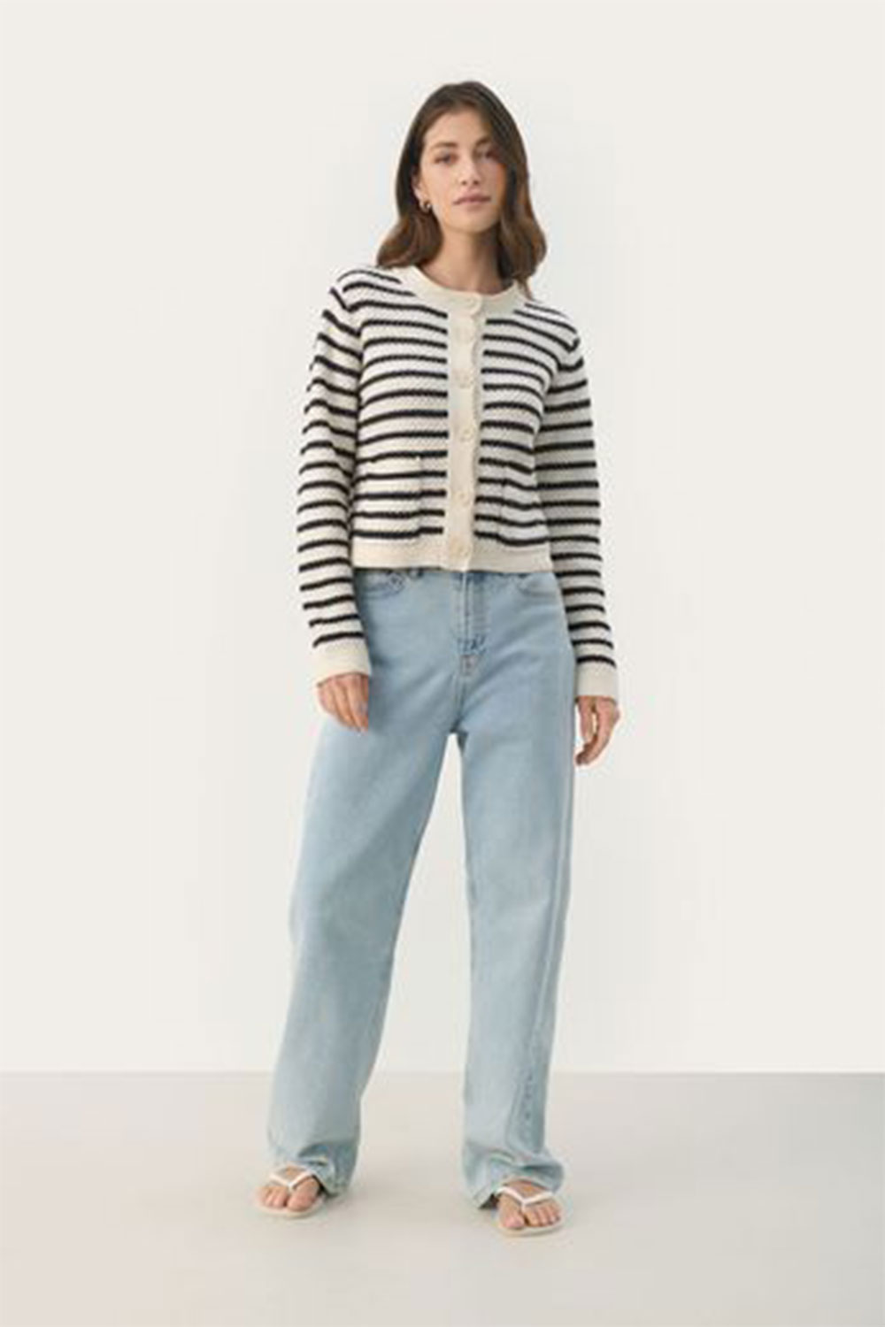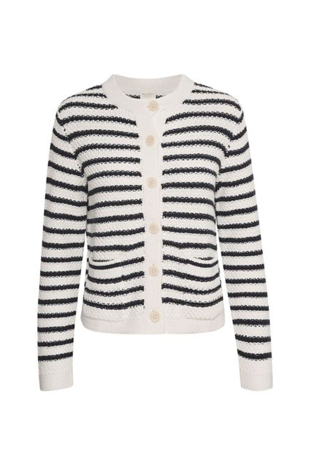 Lovely little button through cardigan with front pockets means this is more jacket thank cardi. Cream edges which elevates the look.